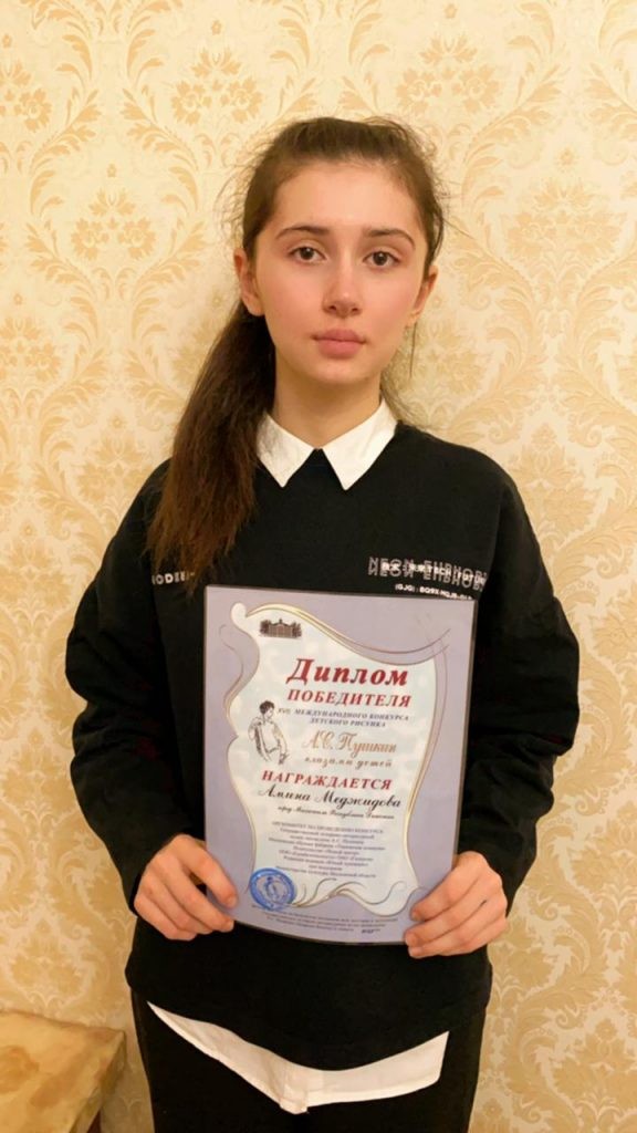 «Амина очень много работала над этим рисунком. Придет домой после школы, сделает уроки и потом как обложится красками, карандашами и сидит до поздней ночи. Я нет-нет и возмущалась: «Сколько ты возишься с этим Пушкиным? Надеюсь, завтра уже не принесешь рисунок домой». А когда она недавно пришла и, вся сияя, сообщила мне: «Помнишь, ты меня ругала за рисунок? Мне сказали, что он победил в конкурсе», – радости моей не было предела. Значит, не зря доченька старалась», – рассказала ее мама Ирина Меджидова.