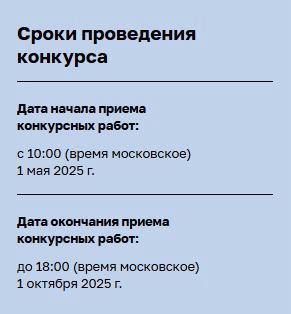 Начало приема конкурсных работ – 1 мая (с 10:00 по московскому времени); окончание – 1 октября (в 18:00 по московскому времени). Участие в Конкурсе является бесплатным.